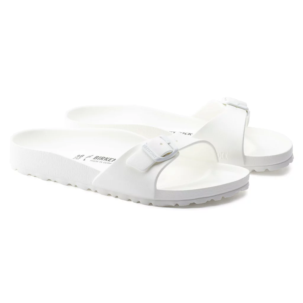Uno de los clásicos más populares de Birkenstock, en una nueva versión moderna. Las sandalias de mujer Madrid Eva están inspiradas en la sandalia de corcho, confeccionadas en EVA. El material plástico EVA es de alta calidad, no tiene olor ni sustancias contaminantes y tiene muchas características positivas: es muy ligero, flexible, resistente al agua, es respetuoso con la piel y ofrece el confort habitual de BIRKENSTOCK. Horma angosta.