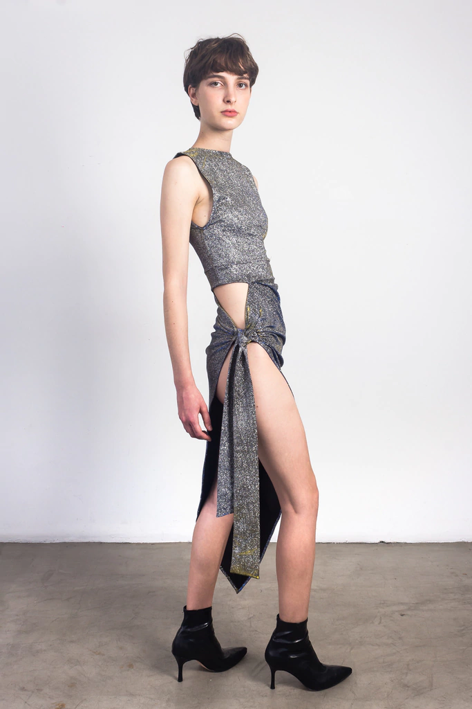 Vestido asimétrico sin mangas, con lazo lateral derecho y espalda abierta.